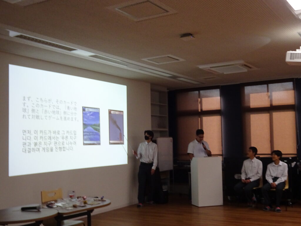 また、京都精華学園からは、中学部のアカデミッククエストと高校の自然科学部が協力し、アカデミッククエストは夏休みから作り上げてきた「日本の文化の紹介」や「私たちの活動の紹介」をするポスターを韓国語の翻訳付きで展示し、自然科学部は「マイアースカード」を紹介しました。マイアースカードは地球温暖化について学ぶことのできるカードゲームで、NPO法人SoELaさんと、京都大学の淡水生物研究会のみなさんとともに制作したものです。カードには、地球温暖化を防ぐと豊かな自然環境が得られるということで、学校のすぐ前を流れる鴨川や、その中に生息する生物などが紹介されており、興味深く取り組んでもらうことができました。